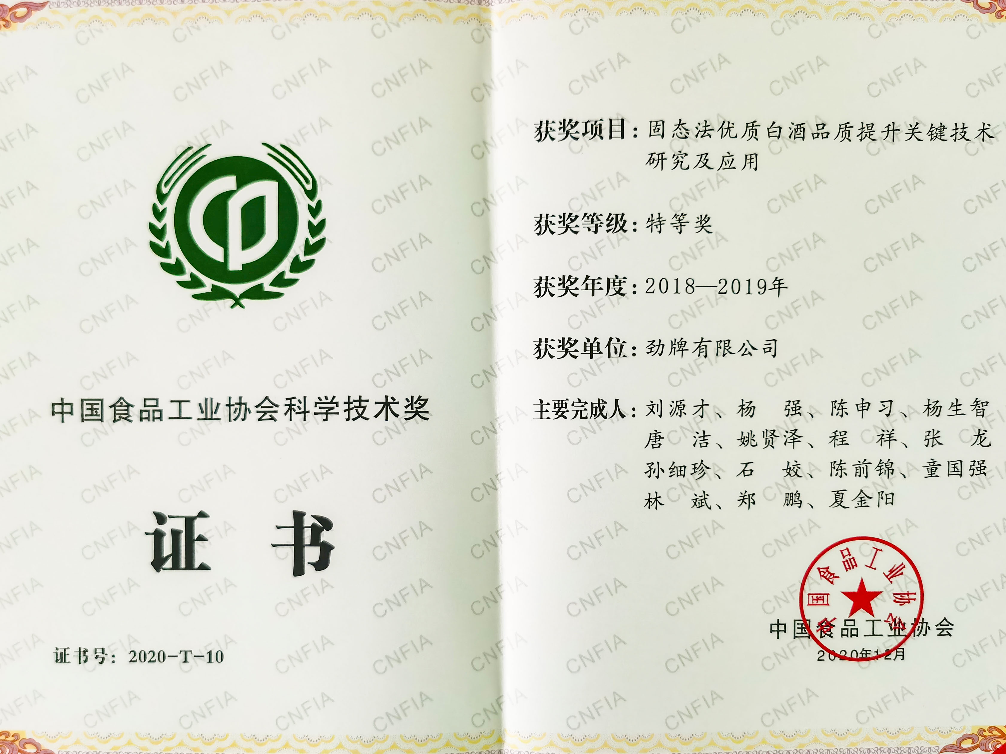 12月6日,2020第四屆中國食品產(chǎn)業(yè)發(fā)展年會暨華糖萬商大會全會在河南鄭州開幕。大會頒發(fā)了2020年度“中國食品工業(yè)協(xié)會科學技術獎”,勁牌公司《固態(tài)法優(yōu)質(zhì)白酒品質(zhì)提升關鍵技術研究及應用》項目榮獲特等獎。